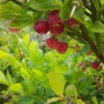 The purple to black fruit ripens from August through to September, growing within the whole shrub, making them more difficult to pick. They’re globular shaped 5-6mm in length and width with an indented tip.