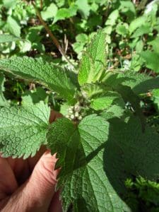 The leaves are 3–8 cm (1.2–3.1 in) long and 2–5 cm (0.79–1.97 in) broad, triangular with a rounded base, softly hairy, and with a serrated margin and a petiole up to 5 cm (2.0 in) long; like many other members of the Lamiaceae, they appear superficially similar to those of the Stinging nettle (Urtica dioica) but do not sting, hence the common name “dead-nettle”.