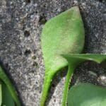 The cotyledons are usually bright green (rarely purplish- or brownish-green), succulent, long and narrow. The first true leaves form a rosette at the base of the plant, and are 0.5 to 4 centimetres (0.20 to 1.57 in) long, with a typically long petiole (exceptionally up to 20 centimetres (7.9 in) long).