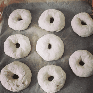 4. Divide the dough into 8 equal pieces. Roll them into smooth balls with the palms of your hands. Push a finger through the centre of each ball and and stretch the dough into bagel shaped rings. Place them on a tray covered with baking paper and cover with a wet tea towel. Let them rest another 15 minutes.