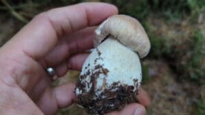 Stem – creamy white, usually very bulbous and often wider than the cap in young mushrooms. The surefire feature to look for is a slightly raised white-on-brown net pattern, called reticulation, around the upper half. If the reticulation is brown on white, you might have found a Bitter Bolete instead – but don’t worry, these aren’t dangerous , they just don’t taste very nice!