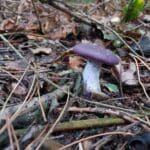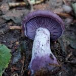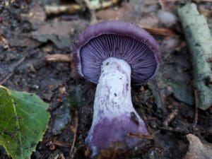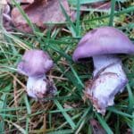 Violet webcap which has the classic webbing that covers the immature gills and then holds remnants of the webbing on the stem, the spores of the Violet Webcap is also Rusty brown instead of whitish pink of the Wood Blewit
