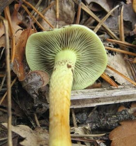 The gills are sulphur-yellow becoming a greeny black with age, adnexed / adnate and crowded.