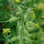 The seed pods are small, lumpy with a long point on the end, and visibly contain multiple small seeds with a characteristically mustard-y taste.