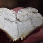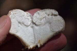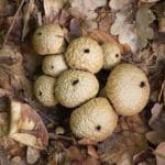 No real cap. The fruit body is usually round or pear-shaped with a small foot or stem. The surface is covered in tiny pyramid-shaped ‘pearls’, which when rubbed off leave a net-like pattern. The surface is white/cream when young darkening with age, they will develop a darker central umbo when they have reached maturity. The flesh when young is almost pure white and spongy, as they mature this will turn to a yellow/green colour as the spores develop.