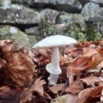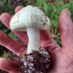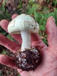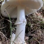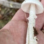 A similar colour to the cap, growing from a large white volva, there is a ‘gutter’ or ridge at the top of the volva