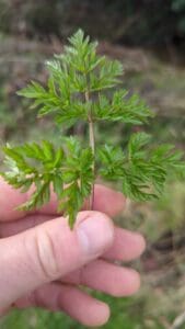 The leaves are triangular overall, fern like with 2-4 pinnate divisions. They have groove running down the stem like Cow Parsley (Anthriscus sylvestris) but they are hairless and have an unpleasant smell when crushed.