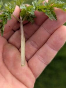 The stems and hollow, grooved and hairless, unlike the hairy stems of Cow Parsley (Anthriscus sylvestris).