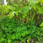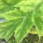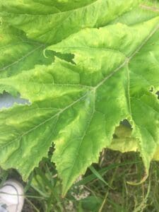 The leaves are large, shiny and deeply lobed. They look intimidating and scary. Deep green in colour, their upper surface is hairless. When fully grown they can be up to 1.5 metres long and almost as wide. The edges are jagged and spiky looking