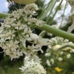 The individual flowers are tiny, white and have 5 petals, they appear as an umbel at the tops of the stems. The flower head looks like the spokes of an umbrella and are lilac to purple in colour. There can be between 50-150 spokes per flowering head. After flowering the plant produces a mass of seeds, up to 50,000 per plant!
