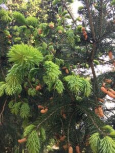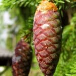 The cones of Norway spruce are the largest of all Spruce species. The tree produces both male and female cones in order to reproduce. The male cones are small and reddish and can be found clustered around stems. The female cones are 10-15 cm long, elongated and oval in shape, and are green-purple in colour. They tend to be a lot more flexible than pine cones and hang downwards.