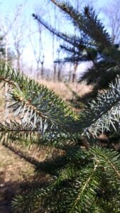 The needles are stiff and sharp and grow individually, around the stem, they have a triangular or square cross section. 0.5cm -2cm long. Each needles is individually attached to the tree and they can be easily rolled between your fingers.