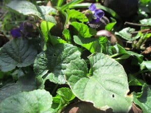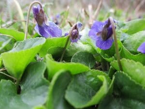 The more common Dog Violet (Viola riviniana) this also has edible flowers and leaves but it lacks any scent. The leaves are smaller, neater heart shapes and a slightly darker shade of green.