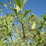 The leaves are deep green to red depending on the time of year, they are lanceolate, opposite and have finely serrated edges. Up to 8cm long.