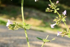 Wood sage (Teucrium scorodonia). Wood sage is not that similar in appearance to Calamint having untoothed oval leaves with cordate base in well spaced pairs and cream coloured flowers in opposite pairs on long branched spikes. Wood sage contains clerodane diterpenes which can cause liver damage so this plant should not be eaten regularly or in any quantity.