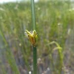 The Yellow Iris and Stinking Iris have flat leaves for their entire length so that the bases of the leave bundles are oval in cross section whereas those of the Reedmace are round. Lesser Reedmace has narrower leaves with curved backs and thinner flower spikes and a gap between male and female parts. Lesser Reedmace is also good to eat.