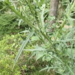 The plant develops two types of leaves, the basal leaves grow from a rosette. These are spear shaped, deeply lobed and are covered in sharp spines. Up to 30cm long. From the centre of the rosette a flowering stalk emerges, which can be up to 1.5 metres tall. The leaves from this are spear shaped and much smaller.