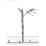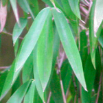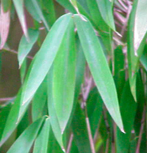 Broad-leaved Bamboo; 12-30 x 3.5-9 cm with 5-13 veins on either side of the midrib.  The leaf sheaths are hairless, bright, shiny green with a yellow midrib. The petioles, (stalk that attaches the leaf to the plant), are greenish yellow.