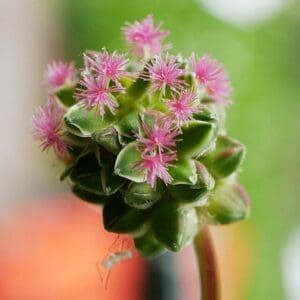 The flowers are tiny, green and mostly closed-up and clustered together like small globules on the end of the stalk. When ripe, a cluster of red styles emerges from the closed flower cup, and a similar cluster of longer yellow anthers droops downwards like a yellow fuzzy beard.