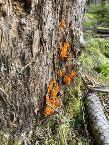 It is relatively large for a jelly fungus, and can reach up to ten centimetres in height. As the name suggests they are typically orange in colour but some examples can be yellow or even white. The antler-like branches are often forked and when wet they have a sticky, waxy surface.