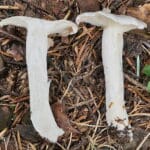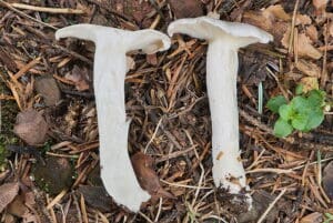 - Appearance: Also white and similar in size, with a funnel-shaped cap and decurrent gills.