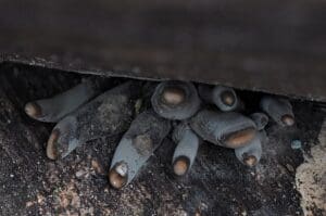 Looking like badly bruised and swollen fingers they often appear in groups looking very much like hands. Individual ‘fingers’ technically called stromata can be really variable in shape and size, but generally around 3–10 cm tall and 1–4 cm wide. It is more or less cylindrical to club -shaped. When young they are pale grey with a whitish tip, getting darker with age. The pale covering (conidia) is a coating of asexual spores produced in the early stage of their development. The stroma‘s surface is covered with tiny pores (perithecia) which release the spores but they cannot be detected by the naked eye.